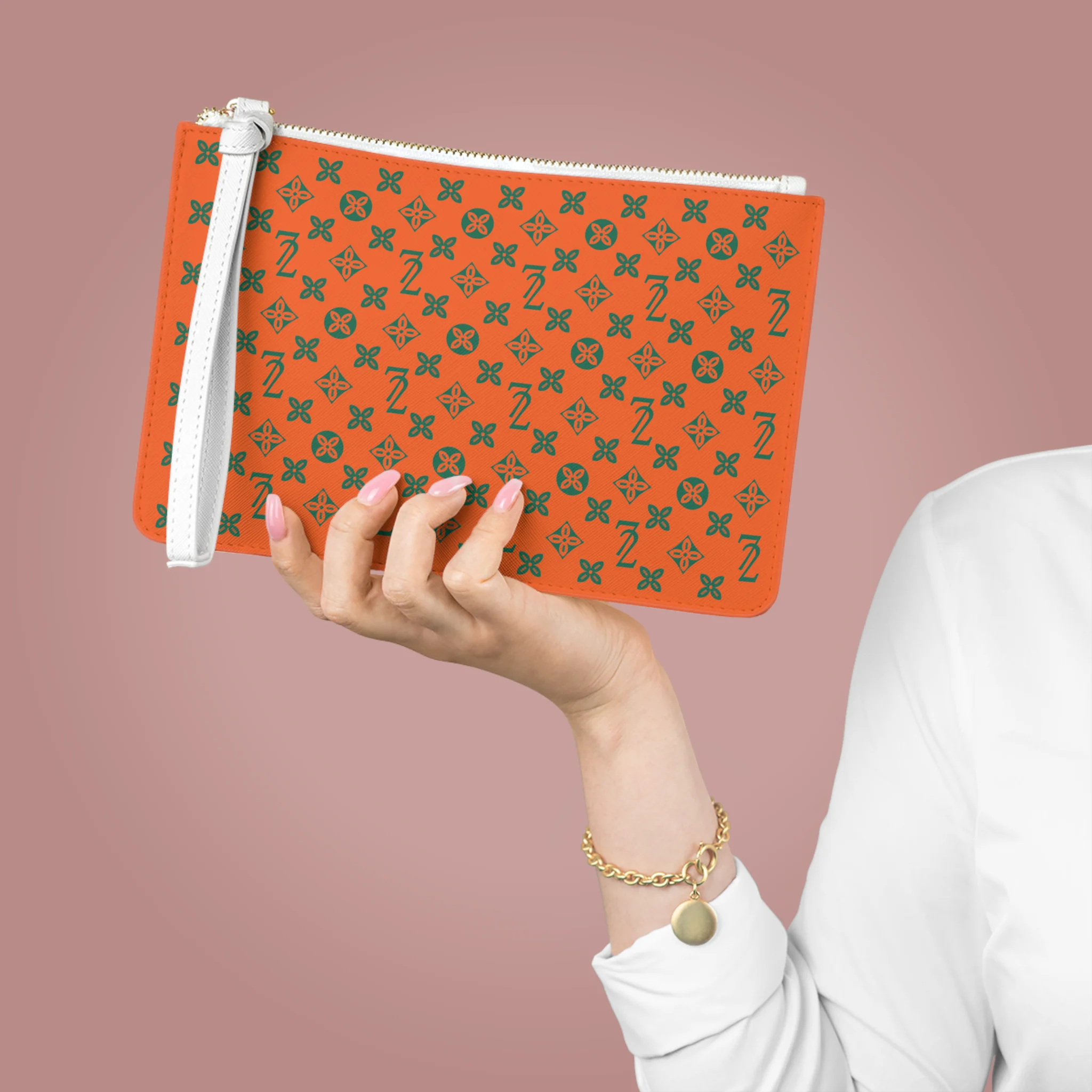 Designed with a loop handle to quickly free your hands, this custom clutch bag is made for the fashionista on the go. It can hold everyday essentials such as a phone, wallet, and keys. It features a zip fastening and a fully lined internal pocket. It is made of vegan leather in the Saffiano pattern finish that was invented by Prada.